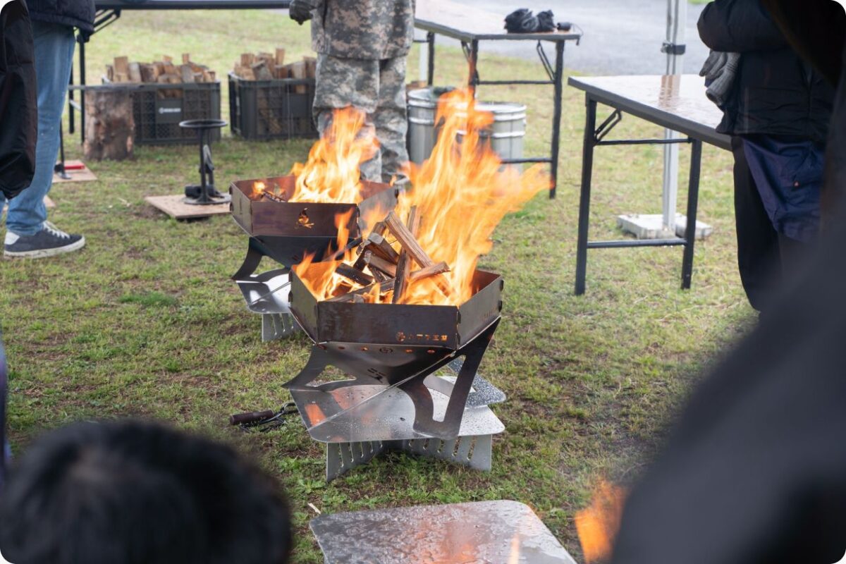 子どもから大人まで楽しみながら学べるアウトドア・防災体験コーナーもご用意。薪割りや火付け、焚き火、火消しが体験できます。キャンプに詳しい方や消防車が傍にいますので安心して楽しめます!他にも、町会の方々による体験コーナーも予定。安全にアウトドアを楽しめるコツを楽しく学んでみませんか?